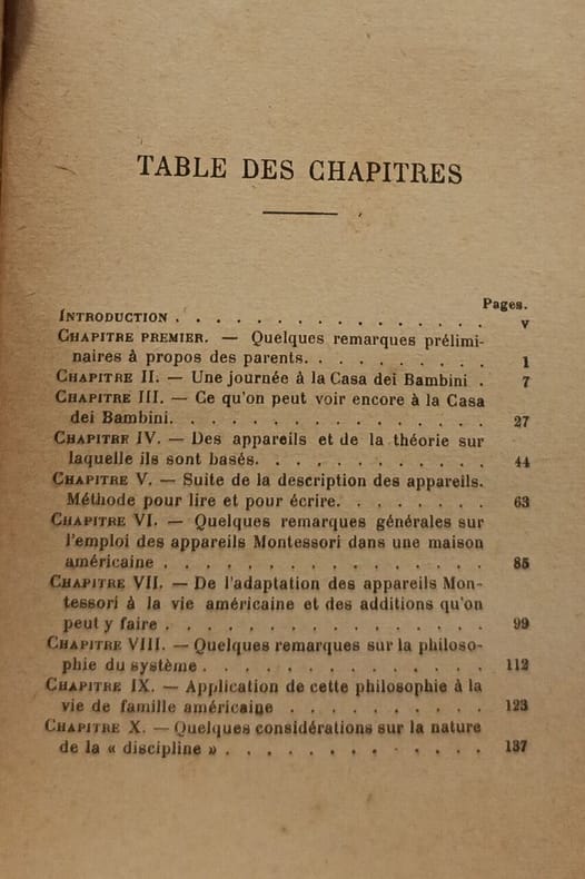 Paris Librairie Fischbacher 236 pages in-12. Sans date. broché. 236 pages. (Années 1930). In-12 (188x120 mm) XXII-236 pages+gravures. Livre broché couverture imprimée de l'éditeur. Les principes qu'applique Mme Montessori dans les "Case dei bambini" causeries et notes d'une mère. Adaptation française de Jacqueline André. Introduction par Mlle Magdeleine Dufresne. 23 gravures en noir hors-texte dont un frontispice. Couverture en bon état général - Au dos une ancienne trace d'eau (peu visible) et de fines plissures verticales. Intérieur propre papier un peu jauni. Poids : 300 gr