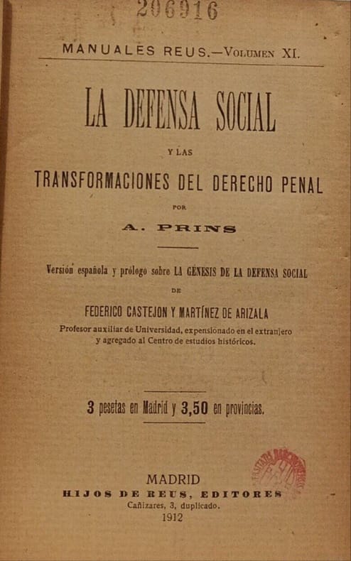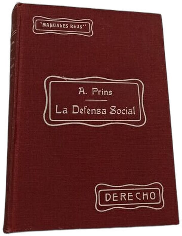 Hijos de Reus Editores 1912 in12. 1912. Cartonnéf. Ouvrage d'Adolphe Prins qui présente et analyse le principe de la défense sociale comme fondement nécessaire à la stabilité des lois sociales en opposition aux doctrines plus radicales comme celles de Pedro Dorado. Le livre examine les transformations du droit pénal classique qui isole le coupable vers une conception plus sociale