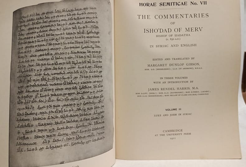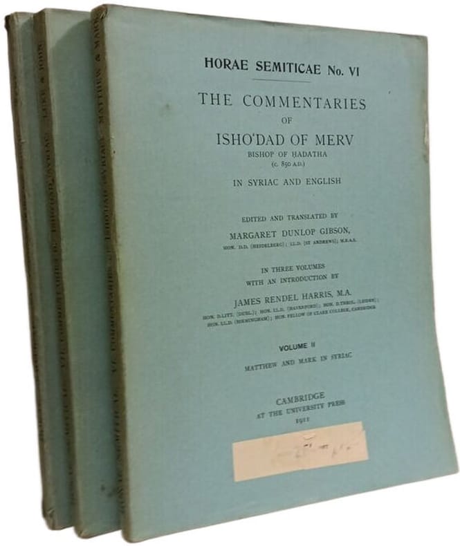 Cambridge at the University Press in4. Sans date. Broché. 3 volume(s). Édition critique et traduction anglaise des commentaires bibliques d'Isho'dad de Merv évêque assyrien influent du IXe siècle sur les quatre Évangiles. Publiée initialement en 1903 par Margaret Dunlop Gibson cette œuvre est considérée comme une contribution monumentale à l'étude des Pères de l'Église d'Orient