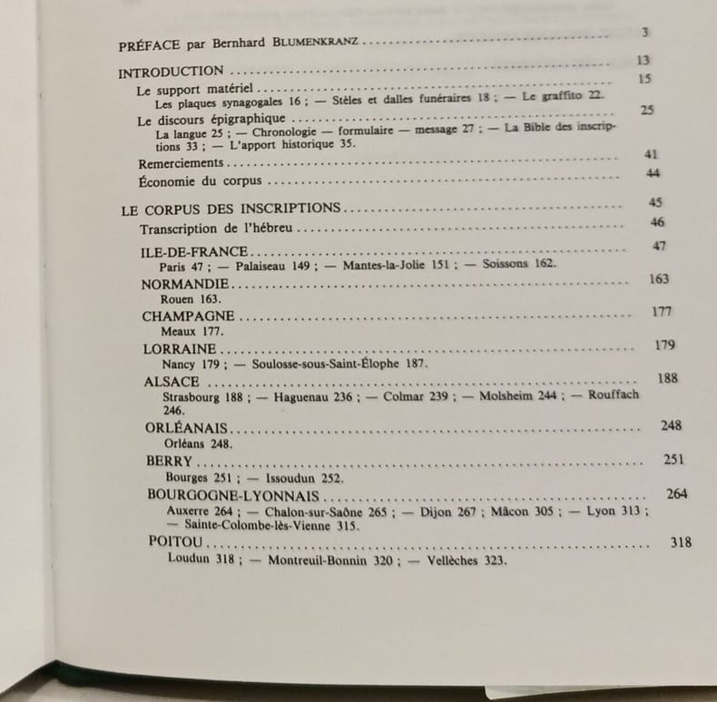 Les Belles Lettres, 1986, gr. in-8° carré, 410 pp, préface de Bernhard Blumenkranz, nombreuses illustrations dans le texte, une carte de France des sites sur les gardes, index, reliure pleine toile verte de l'éditeur, titres et motif hébraïque en blanc au 1er plat, jaquette illustrée, bon état (Coll. Franco-Judaïca)