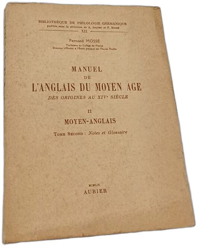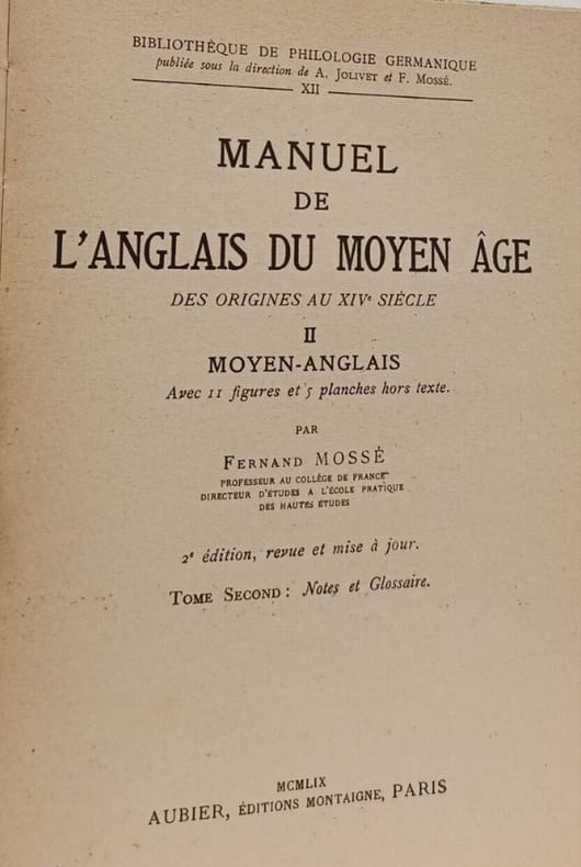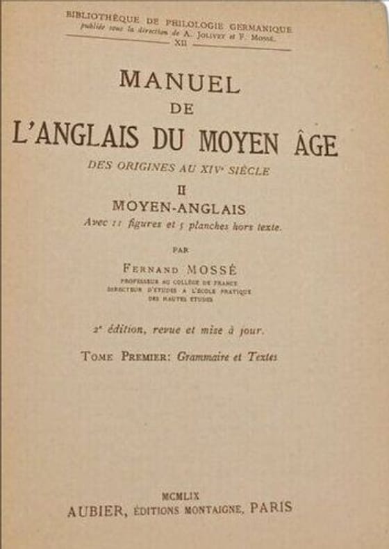 Aubier Editions Montaigne Paris 1959 in8. 1959. Broché. Ce manuel de Fernand Mossé publié par Aubier constitue une référence de premier ordre pour l'étude de l'anglais du Moyen Âge couvrant la période des origines au XIVe siècle. Il s'adresse à la fois aux débutants et à ceux souhaitant acquérir une connaissance approfondie du vieil-anglais et du moyen-anglais avec une approche structurée en grammaire textes notes et glossaires