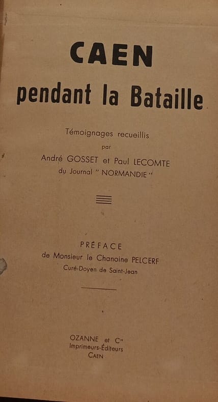 Ozannee et C* in8. Sans date. Cartonné. Recueil de témoignages sur la bataille de Caen en 1944 compilé par les journalistes André Gosset et Paul Lecomte du journal 'Normandie'. L'ouvrage documente les expériences des civils pendant les bombardements et les combats avec une préface du Chanoine Pelcerf. Il couvre la période jusqu'à la fermeture de la poche de Falaise en août 1944