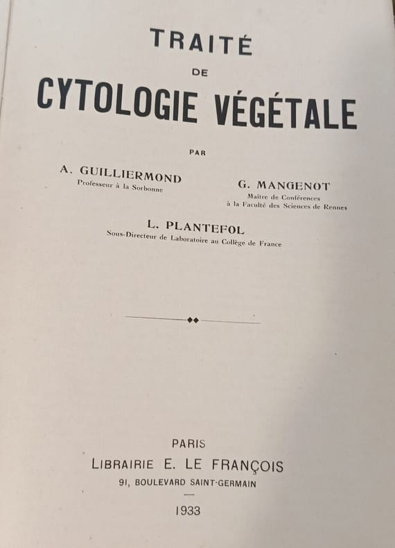 Librairie E. Le François 1933 in8. 1933. Cartonné. Traité scientifique majeur publié en 1933 par A. Guilliermond G. Mangenot et L. Plantefol offrant une étude approfondie de la cellule végétale. L'ouvrage de 1197 pages est structuré en chapitres couvrant les composants cellulaires fondamentaux (cytoplasme chondriome noyau vacuoles) et comprend 464 figures explicatives