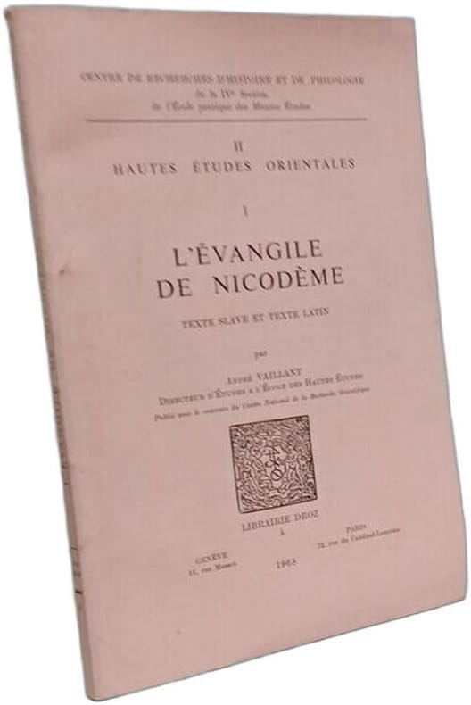 Librairie Droz 1968 in8. 1968. Broché. Il s'agit d'une édition bilingue (latin-slave) de l'Évangile de Nicodème un texte apocryphe chrétien éditée et préfacée par André Vaillant publiée par la Librairie Droz en 1968