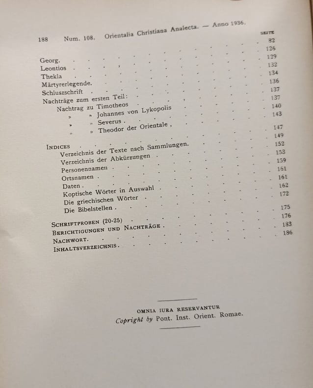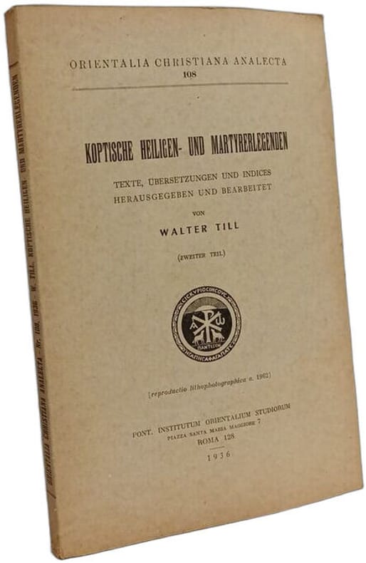 Pont. Institutum Orientalium Studiorum 1936 in8. 1936. Broché. Ouvrage académique en deux volumes édité par Walter Till présentant des textes coptes de légendes de saints et de martyrs avec leurs traductions allemandes et des indices. Publié par le Pontificium Institutum Orientalium Studiorum dans la collection Orientalia Christiana Analecta