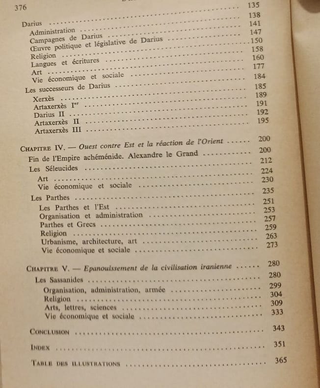 103 dessins de Madame Tania Ghirshman, 5 cartes et 16 planches hors-texte totalisant 24 photographies en noir et blanc (complet) Nouvelle édition revue et mise à jour, 1976 Contents, Chapitres : Avant-propos - Configuration physique de l'Iran - 1. Préhistoire : L'homme de la grotte - Le premier sédentaire de la plaine - Civilisation préhistorique de l'Iran, au Ive millénaire avant J.-C. - L'Iran aux abords du IIIe millénaire - L'Iran au IIIe millénaire - L'Iran au IIe millénaire - L'Elam - Les Kassites -2. L'arrivée des iraniens : L'immigration des Mèdes et des Perses - Formation de l'unité mède - Cimmériens et Scythes - Royaume mède - Bronzes du Luristan - Cyaxare - Trésor de Ziwiyé - L'Elam et les Perses, début des Achéménides - 3. Est contre Ouest : L'empire achéményde - Cyrus, chute de Babylone, Pasargade - Cambyse - Darius (Administration - Campagnes de Darius - Oeuvre politique et législative - Religion - Langues et écritures - Art - Vie économique et sociale) - Les successeurs de Darius : Xerxès - Artaxerxès 1er - Darius II - Artaxerxès II et III - 4. Ouest contre Est et la réaction de l'Orient : Fin de l'Empire achéménide, Alexandre le Grand - Les Séleucides (Art - Vie économique et sociale) - Les Parthes (Les Parthes et l'est - Organisation et administration - Parthes et Grecs - Religion - Urbanisme, architecture, art - Vie économique et sociale) - 5. Epanouissement de la civilisation iranienne : Les Sassanides (Organisation, administration, armée - Religion - Arts, lettres, sciences - Vie économique et sociale) - Conclusion - Index - Table des illustrations couverture à peine jaunie avec d'infimes traces de pliures, intérieur sinon frais et propre, papier à peine jauni, cela reste un bon exemplaire, bien complet des 16 planches hors-texte