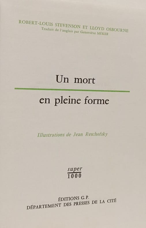 Éditions G.P 1968 in8. 1968. Cartonné. Un mort en pleine forme est la traduction française du roman "The Wrong Box" (Un mort encombrant) écrit en collaboration par Robert Louis Stevenson et son beau-fils Lloyd Osbourne et publié en 1889. L'histoire une comédie farcesque tourne autour d'un héritage familial et d'un cadavre encombrant et a été adaptée au cinéma en 1966