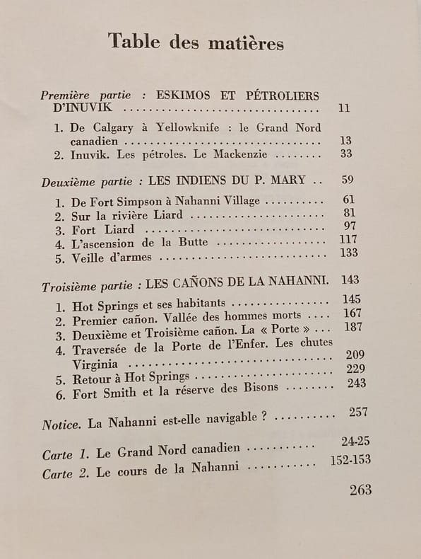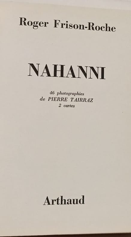 Arthaud 1969 in8. 1969. Cartonné. Nahanni est le récit de l'expédition en canot de Roger Frison-Roche sur la rivière Nahanni dans les territoires du Nord-Ouest canadien (Alaska). L'auteur y décrit avec précision les paysages glacés les dangers de la navigation et l'immensité d'une nature intacte tout en évoquant les légendes de cette région redoutable