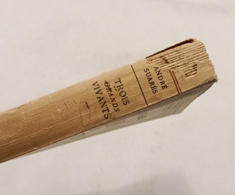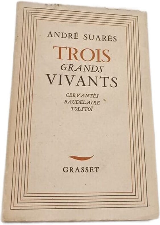 Grasset 1938 in12. 1938. Broché. Essai d'André Suarès publié en 1937 par Grasset présentant des portraits intellectuels de trois grandes figures littéraires : Miguel de Cervantès Charles Baudelaire et Léon Tolstoï. L'ouvrage analyse leur vie et leur œuvre avec une attention particulière à leur caractère et leur impact comme en témoigne la citation sur Tolstoï 'Avide d'amour et incapable de ne pas peser sur ce qu'il aime'