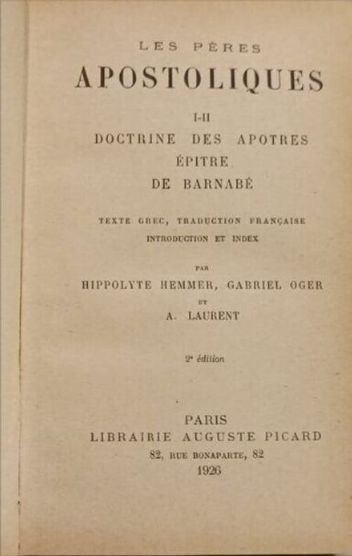 Auguste Picard 1926 in12. 1926. Cartonné. Il s'agit d'une édition critique et bilingue (grec-français) de deux textes chrétiens anciens majeurs : la Doctrine des Douze Apôtres (Didachè) et l'Épître de Barnabé. L'ouvrage publié par Auguste Picard en 1907 comprend une introduction une traduction et des index réalisés par Hippolyte Hemmer Gabriel Oger et Auguste Laurent dans la collection "Textes et documents pour l'étude historique du Christianisme"