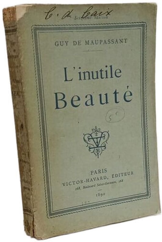 Ollendorf Oeuvres complètes illustrées de Guy de Maupassant Livre illustré 1904 In-4 (16,5 x 25,7 cm), broché sous couverture rempliée illustrée, 301 pp., un des 25 ex. sur vélin nominatif (pour Monsieur Alfred Humblot), illustrations dans le texte et hors-texte noir et blanc de Maurice de Lambert, gravées sur bois par G. Lemoine ; dos fendu, ouvrage séparé en deux mais par ailleurs bien complet, intérieur frais, en l'état. Livraison a domicile (La Poste) ou en Mondial Relay sur simple demande.