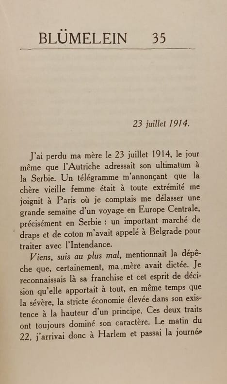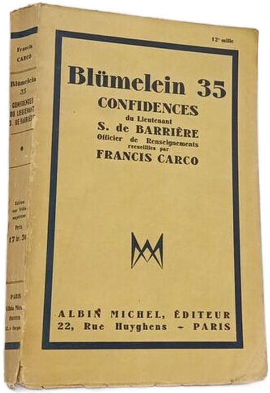 Un grand roman d'espionnage. Versé dans l’aviation sur la base d’Avord à côté de Bourges, Carco écrit ici l’histoire vraie d’un officier de renseignement, véritable espion avant l’heure. Le héros, agent de renseignements malgré lui pendant la première guerre mondiale, un anti-James Bond avant la lettre, préfigure les personnages de Graham Greene et de John Le Carré. Quand à la belle et mystérieuse Blümelein 35, certains y voient en filigrane la silhouette de Mata-Hari. — Un ouvrage qui sera porté sur la liste « Otto » des livres interdits et détruits par ordre des autorités hitlériennes en septembre 1940.
