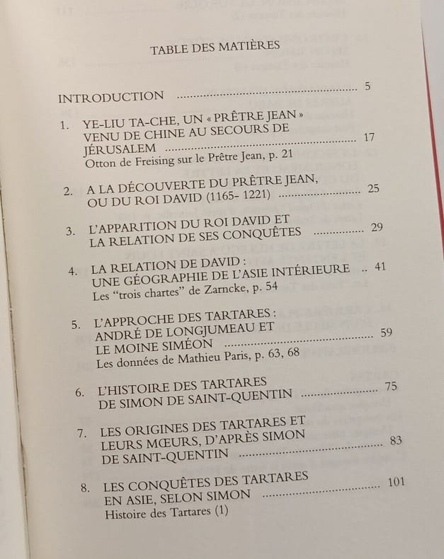 L'apparition des Mongols, surgissant dans les premieres decennies du XIIIe siecle des profondeurs de l'Asie, a change le destin de l'Europe orientale. Elle a en meme temps ouvert aux Europeens de l'Ouest les routes de l'Asie. Depuis la fin de l'epoque romaine, des peuples venus des steppes s'etaient succedes, penetrant a plusieurs reprises, plus ou moins profondement dans l'espace europeen ou plusieurs d'entre eux s'etaient implantes. Les Occidentaux ne s'etaient guere preoccupes de s'informer das causes de ces migrations et de leur llieu d'origine. La premiere campagne mongole en 1222 n'avait pas inquiete l'Occident. Il en fut autrement de la seconde, pendant laquelle les "Tartares" arriverent en Hongrie en 1237 et poursuivirent leur avance en direction de l'Ouest; mais cette menace s'estompa vers 1260. Il fallut pour que les choses changent, que le danger se rapproche des terres franques du royaume latin d'Orient. C'est lorsque les Mongols menacent Antioche, en 1243, que l'on commence a s'emouvoir. Et c'est alors qu'apparaissent les ambassades, qui seront en meme temps des voyages de decouverte. Ce sont ces relations de voyage, les unes developpees, les autres tres breves, qui sont presentees dans ce recueil. On y lira les temoignages suivants: l'emergence de l'image du Pretre Jean chez Otton de Freising, la Relation de David (en deux versions), les renseignements donnes a Mathieu Paris par Andre de Longjumeau, l'Histoire des Tartares de Simon de Saint-Quentin, des lettres du gouverneur de Perse Eljigidei ou celle de Hulegu a Saint Louis, ou celle du connetable d'Armenie a des cousins francs. Tous ces documents anterieurs aux voyages de Marco Polo nous offrent un apercu inedit en traduction francaise de la facon dont les occidentaux ont essaye de s'informer sur la civilisation et le monde mongols dans la deuxieme moitie du XIIIe siecle. Languages : French.