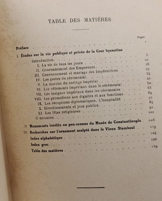 Première partie : Les anciens sanctuaires de Constantinople. La dispersion des trésors des sanctuaires. Index alphabétique et des mots grecs. Deuxième partie, extraite de la Revue d'histoire des religions : Etudes sur la vie publique et privée de la cour byzantine. Monuments inédits ou peu connus du Musée de Constantinople. Recherches sur l'ornement sculpté dans le vieux Stamboul. Index alphabétique et grec. Les 7 dernières pages renferment : "Sculptures chrétiennes inédites du Musée de Constantinople", avec 3 fig. Dos passé, bonne condition int. -