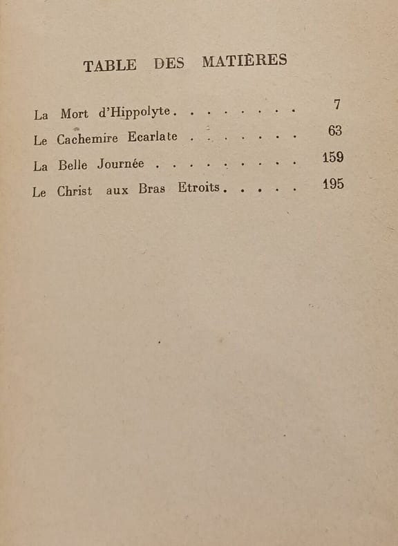 Paris Gallimard Editions de la Nouvelle Revue Française NRF 1928. Petit in-8 239pp. Demi chagrin bleu nuit, dos à nerfs rehaussés d'un filet doré, plats de couverture et dos conservés, reliure de l'époque. Première édition collective de: La mort d'Hippolyte, Le cachemire écarlate, La belle journée, Le Christ aux bras étroits. Talvart et Place X, p344.