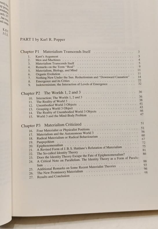 Springer 1985 614 pages 15 6x4 2x23 2cm. 1985. Cartonné. 614 pages. Ouvrage co-écrit par le philosophe Karl Popper et le neurophysiologiste John Eccles défendant une théorie interactionniste de la relation entre l'esprit et le cerveau. Le livre s'oppose au matérialisme et au parallélisme explorant la possibilité d'une influence réciproque entre les phénomènes mentaux et les processus cérébraux