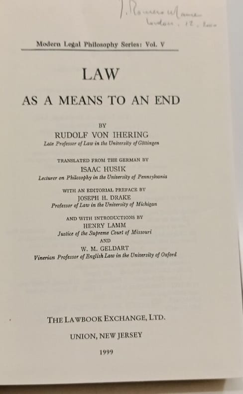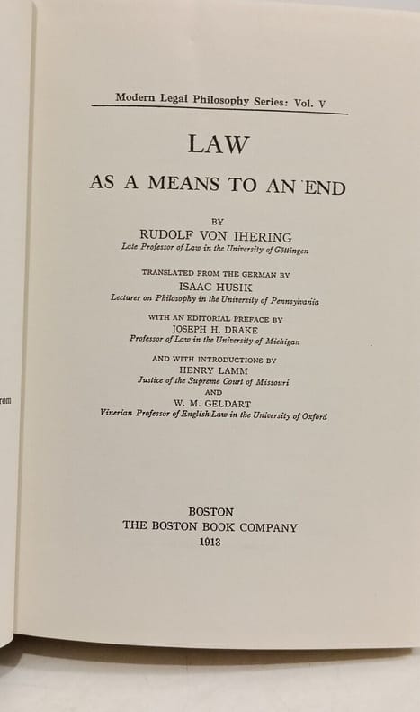 Lawbook Exchange Ltd 1999 544 pages 15 75x4 57x22 86cm. 1999. Cartonné. 544 pages. Cet ouvrage est la traduction anglaise de la première partie de 'Der Zweck im Recht' de Rudolf von Jhering un juriste allemand du XIXe siècle. Il développe l'idée que le droit doit être conçu comme un instrument pour réaliser la justice sociale s'opposant ainsi à l'abstraction philosophique et au conceptualisme dans la jurisprudence de son époque