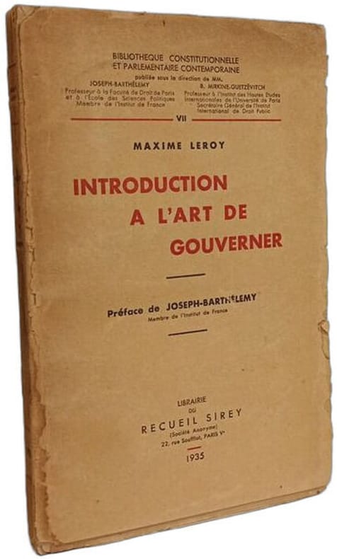 Recueil Sirey 1935 in8. 1935. Broché. Ouvrage de Maxime Leroy publié en 1935 qui propose une réflexion sur l'art de gouverner mêlant approche sociologique comparatiste et perspective historique individualiste avec une préface de Joseph-Barthélemy. Le livre s'inscrit dans l'étude des transformations de la puissance publique de la loi et des institutions syndicales