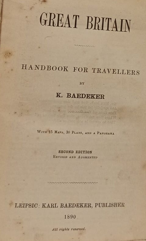Karl Baedeker 1890 in12. 1890. Cartonné. Guide de voyage historique de la série Baedeker publié à la fin du 19e et au début du 20e siècle offrant des informations détaillées sur l'histoire la culture et la géographie de la Grande-Bretagne accompagné de cartes et de conseils pratiques pour les voyageurs