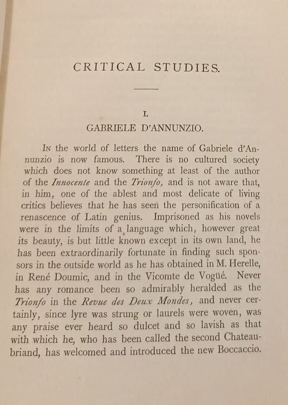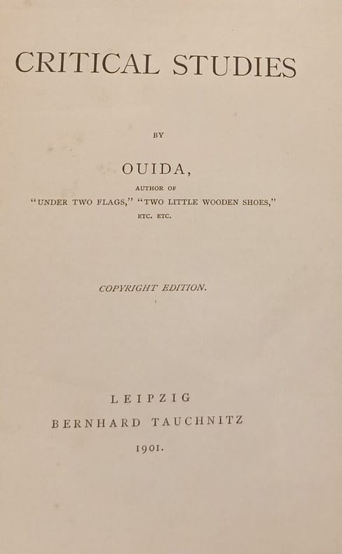 Bernhard Tauchnitz 1901 in12. 1901. Cartonné. « Critical Studies » est un recueil d'essais littéraires publié par Ouida à la fin du 19ème siècle. L'ouvrage compile des analyses critiques d'auteurs contemporains comme Gabriele D'Annunzio et Georges Darien explorant la complexité des personnages les fondements moraux des récits et des thèmes comme la justice sociale et le genre