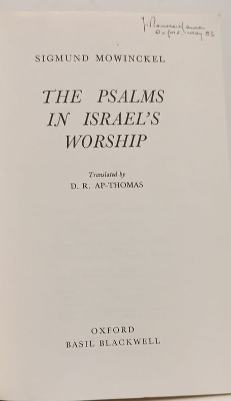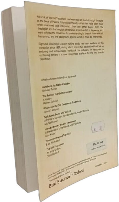 Blackwell Publishers 1983 328 pages in8. 1983. Broché. 328 pages. Ouvrage académique majeur de Sigmund Mowinckel traduit par AP-Thomas qui analyse les Psaumes dans leur contexte cultuel et liturgique en Israël antique. L'œuvre explore les différents types de psaumes (hymnes de louange lamentations actions de grâce) et leur relation avec la vie dévotionnelle de la communauté fournissant le cadre des études modernes sur les Psaumes