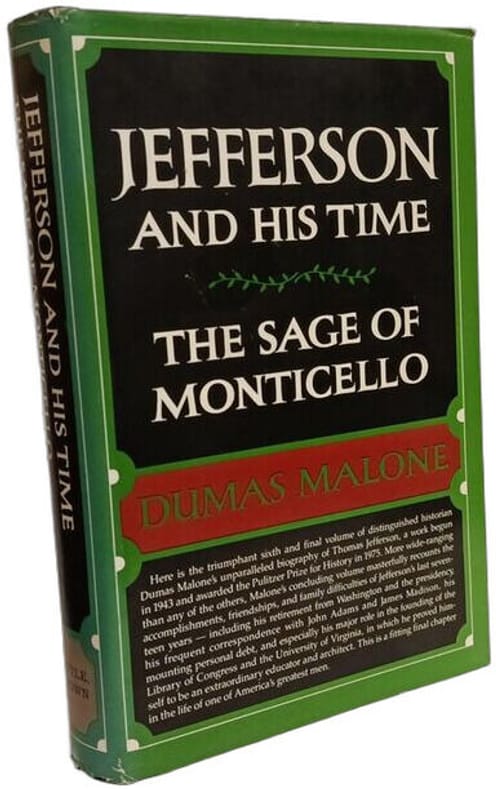 Little Brown & Co 1981 551 pages 14 732x3 81x22 098cm. 1981. Cartonné jaquette. 551 pages. Sixième et dernier volume de la monumentale biographie en six tomes de Thomas Jefferson par Dumas Malone couvrant les dix-sept dernières années de sa vie après sa présidence incluant sa retraite à Monticello sa correspondance ses difficultés financières et ses relations familiales. L'œuvre a reçu le Prix Pulitzer d'histoire et est considérée comme la référence biographique sur Jefferson