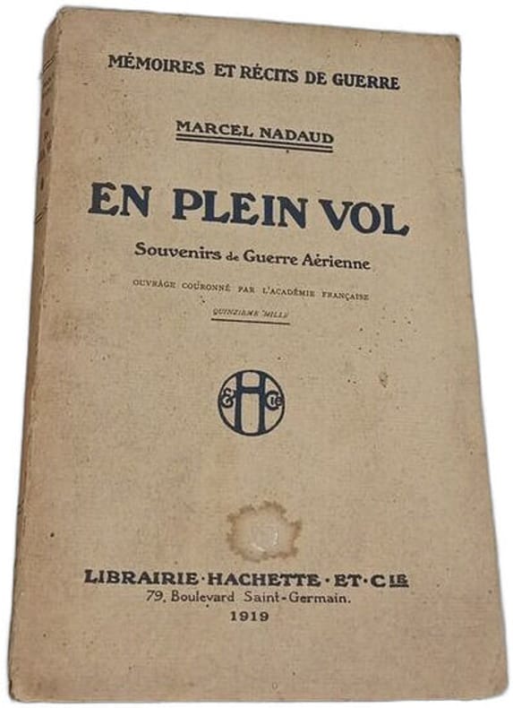 "Les hommes taupes sont assoupis au fond des boyaux. Au ras de la tranchée, des coquelicots se balancent au soleil. De temps en temps, une marmite passe avec un bourdonnement étrange, irrégulier, semblable au roulement d'un railway aérien, et va s'écraser plus loin." — Mobilisé comme soldat dans l'infanterie à la déclaration de guerre, Nadaud est désigné pour rejoindre l'aviation en juin 1915. — "C'est un monde particulièrement vivant, gai, ardent, héroïque, que celui des aviateurs. Monde un peu fermé aussi, et mal connu des soldats des autres armes comme de la majorité du public. On y pénétrera en lisant les « Souvenirs de guerre aérienne » que publie M. Marcel Nadaud sous ce titre expressif : “En plein vol”. On sera par là initié au vocabulaire spécial, imagé et pittoresque en usage dans la « 5e armée », on assistera tour à tour à des spectacles grandioses, à des scènes ou tragiques, ou pleines d'une verve endiablée, à d'épiques prouesses. “En plein vol” est un livre enthousiaste et suggestif, qui renseigne et fait admirer." (La Revue du front et le Souvenir : mémorial de la Grande Guerre, 1917)