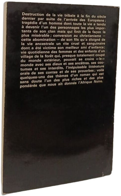 Présence Africaine 1973 in12. 1973. Broché. Premier roman de l'écrivain nigérian Chinua Achebe publié en 1958 (1960 pour la traduction française) 'Le Monde s'effondre' raconte la vie dans un village Igbo du Nigeria à la fin du XIXe siècle dépeignant l'harmonie et les tensions de la société précoloniale avant que l'arrivée des missionnaires et colons britanniques ne provoque un choc culturel brutal. L'histoire suit la chute tragique du protagoniste Okonkwo leader respecté dont le destin personnel s'entremêle avec l'effondrement de sa culture face à la colonisation