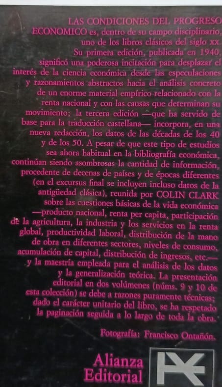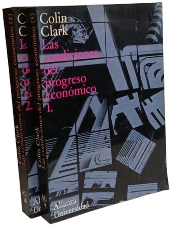 Alianza Universidad 1971 in8. 1971. Broché. 2 volume(s). Ouvrage fondateur de Colin Clark publié initialement en 1940 qui marque un tournant vers l'analyse empirique du développement économique. Le livre examine les causes du progrès économique à travers une étude comparative internationale des revenus nationaux réels de la productivité par secteur et de la distribution de la main-d'œuvre