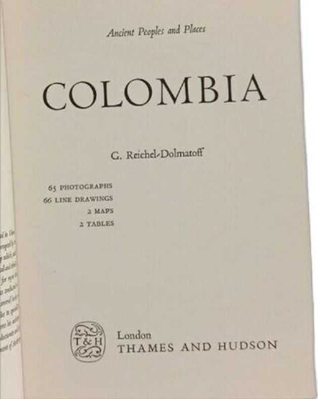 Thames and Hudson 1965 in8. 1965. Cartonné. Ouvrage académique de Gerardo Reichel-Dolmatoff publié en 1965 dans la série 'Ancient Peoples and Places' qui traite des développements culturels et institutions préhistoriques en Colombie incluant l'étude des Taironas et la notion d'aires culturelles