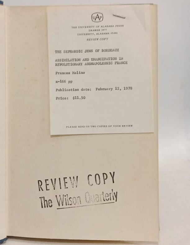 The University of Alabama Press 1978 200 pages 24 13x1 778x16 256cm. 1978. Cartonné. 200 pages. Ce livre de Frances Malino examine l'histoire de la communauté sépharade de Bordeaux pendant la période révolutionnaire et napoléonienne en se concentrant sur les processus d'assimilation et d'émancipation. L'ouvrage analyse également les tensions entre les Juifs sépharades de Bordeaux et les Juifs ashkénazes de France ainsi que leur rôle dans les relations avec Napoléon et la formation du Grand Sanhédrin