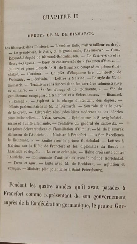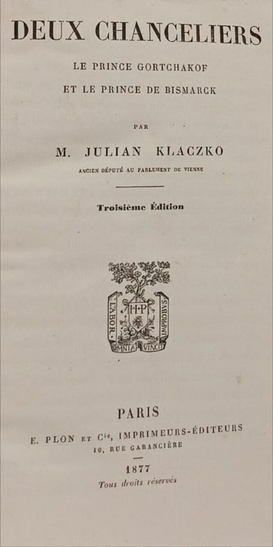 "... Klaczko avait pris pour héros de sa nouvelle œuvre les deux personnages alors les plus saillants de la politique contemporaine, les chanceliers de l’Empire russe et de l’Empire allemand. Je ne veux point analyser on détail cet ouvrage qui doit être présent encore à toutes les mémoires. Nul en effet ne peut avoir oublié le récit des missions du prince Gortchakof, les débuts et l’ambassade de M. de Bismarck à Saint-Pétersbourg, la relation saisissante des campagnes de la Vistule, de l’Elbe et de Bohême, l’éclipse de l’Europe après Sadowa, le résumé si clair de la guerre de France et le triste bilan de l’association prusso-russe devenue si fatale à l’Occident. Qui ne se rappelle les croquis si fins tracés par une plume alerte et où revivaient Nesselrode, Napoléon III, le futur Guillaume Ier, Alexandre II, Thiers, Drouyn de Lhuys, John Russell, Govone, Benedetti, Manteuffel, de Moustier, Rouher, Nigra, de Rechberg, Fuad-Pacha et d’autres acteurs, plus ou moins importants, d’un drame en plusieurs actes. Nul historien n’a mieux pénétré les secrets de la politique allemande, française ou russe. Nul, mieux que Klaczko, n’a dépeint les actes du Parlement de Francfort et du Congrès de Paris, le rôle de la Confédération germanique, l’humiliation d’Olmütz et la haine croissante de la Prusse contre l’Autriche, la rupture de l’entente franco-anglaise après l’annexion de la Savoie et les profits que la Russie en tira, l’habileté supérieure de Bismarck à Pétersbourg, à Paris et à Biarritz, ses succès prodigieux dans les terribles événements qui suivirent, l’effondrement de l’Autriche, l’effarement de la France et ses douloureux revers retracés avec tant d’art et tant de vérité !… Que de considérations justes et éloquentes ! Que d’observations poignantes et originales ! Que de leçons !" (Henri Welschinger, Julian Klaczko, historien, critique et patriote, Revue des Deux Mondes, 1907) — Par l'historien polonais Julian Klaczko (1828-1907) — "Venu à Paris en 1849, il donna à la Revue des Deux Mondes une série d'articles très remarqués qu'il réunit plus tard en volumes sous les titres suivants : “Une annexion d'autrefois ; l'union de la Pologne et de la Lithuanie” (2e éd., 1869) ; “l'Agitation unitaire en Allemagne” (1862) ; “Études de diplomatie contemporaine” (1866) ; “Les Préliminaires de Sadowa” (1868-1869). Rentré en Pologne, il fut nommé conseiller du ministère autrichien des Affaires étrangères (1866-1870). Outre les volumes cités, il en laisse quelques autres, écrits eux aussi en français, et parmi lesquels il faut citer surtout “Deux chanceliers : le prince Gortchakof et le prince de Bismarck” (1876) et “Rome et la Renaissance : Jules II” (1898)." (Revue Historique, 1907)