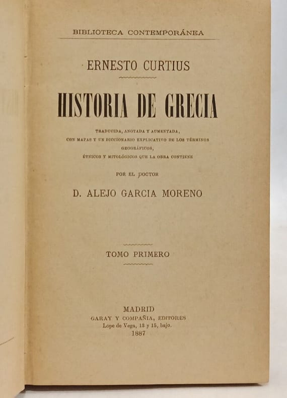 Garay y Compania 1887 in8. 1887. Cartonné. 8 volume(s). Historia de Grecia. Traducida anotada y aumentada con mapas y diccionario explicativo de los términos geográficos étnicosy mitológicos que la obra contiene por el Doctor D. Alejo García Moreno ---- TOMES I à VIII