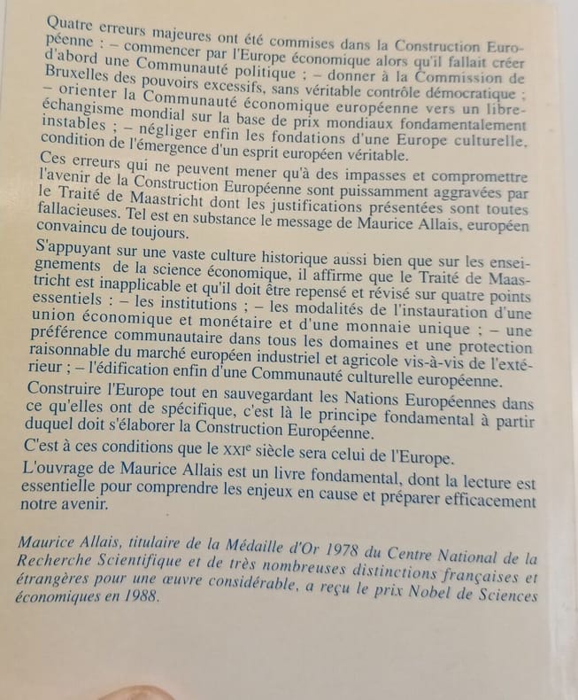 Clément Juglar 1992 381x69x559cm. 1992. Broché. Dans cet essai Maurice Allais prix Nobel d'économie analyse les défauts structurels du projet européen. Il identifie les erreurs et impasses de la construction européenne et propose des pistes de réflexion pour une meilleure intégration notamment en révisant les traités sur les institutions l'union économique et monétaire et la protection du marché