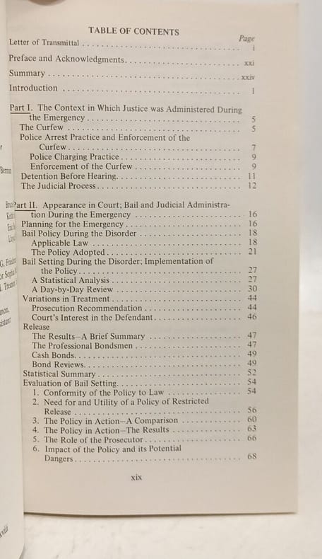 U.s. government printing office 1969 in8. 1969. Broché. Ce document est un rapport officiel commandé par le Comité du District de Columbia sur l'administration de la justice dans des conditions d'urgence. Il analyse spécifiquement les politiques de fixation de caution par le tribunal de D.C. et les politiques de poursuite du bureau du procureur des États-Unis pendant et après les troubles civils de mai 1968
