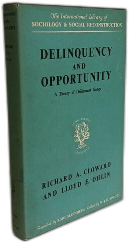 Routledge & kegan paul 1961 in8. 1961. Cartonné jaquette. Cet ouvrage présente la théorie des opportunités différentielles une analyse sociologique intégrée de la délinquance des gangs. Les auteurs Richard Cloward et Lloyd Ohlin relient les travaux de Durkheim et Merton à ceux de Shaw McKay et Sutherland pour expliquer comment l'accès inégal aux moyens légitimes et illégitimes influence la formation de sous-cultures délinquantes particulièrement chez les jeunes hommes des classes défavorisées