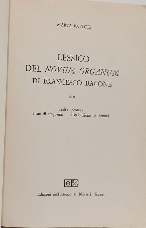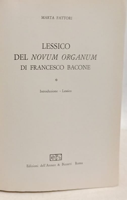 Edizioni dell'Ateneo & Bizzarri Roma 1980 in8. 1980. Broché. 2 volume(s). Actes d'un séminaire international tenu à Rome en 1984 édité par Marta Fattori qui examine la terminologie et l'influence de Francis Bacon au XVIIe siècle. L'ouvrage s'inscrit dans la collection 'Lessico intellettuale europeo' et rassemble des contributions de spécialistes sur la réception et la fortune des idées baconiennes
