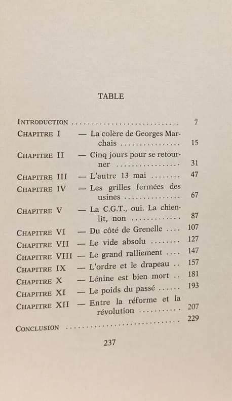 1ere édition Contents, Chapitres : La colère de Georges Marchais - 5 jours pour se retourner - L'autre 13 mai - Les grilles fermées des usines - La C.G.T. oui, le chienlit non - Du côté de Grenelle - Le vide absolu - Le grand ralliement - L'ordre et le drapeau - Lénine est bien mort - Le poids du passé - Entre la réforme et la révolution exemplaire augmenté d'un envoi autographe de l'auteur
