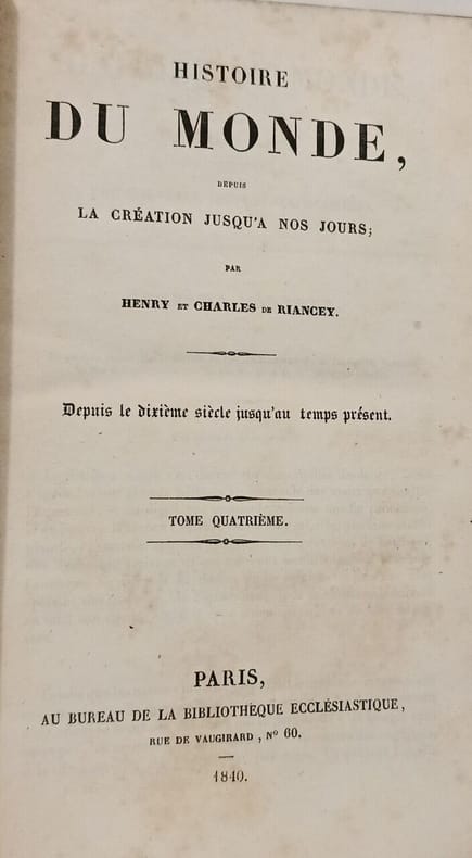 Au Bureau de la Bibliothèque Ecclésiastique 1840 in8. 1840. Relié. Cette œuvre en quatre tomes publiée entre 1838 et 1840 propose une histoire du monde depuis la Création jusqu'au XIXe siècle. Éditée par la Bibliothèque Ecclésiastique elle est complétée par un tableau chronologique et alphabétique des principaux événements