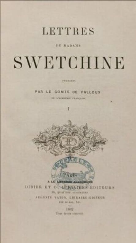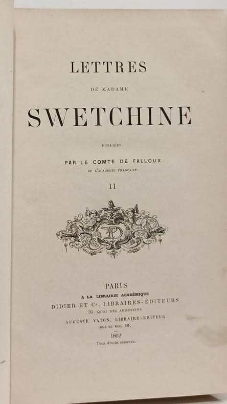 NOTA : Sofia Petrovna Svetchina, dite Madame (Sophie) Swetchine, née Soïmonova , le 22 novembre 1782 à Moscou et morte le 26 août 1857 à Paris, est une salonnière, épistolière et femme de lettres russe. Classification Dewey : 891.7-Littérature russe (slave)