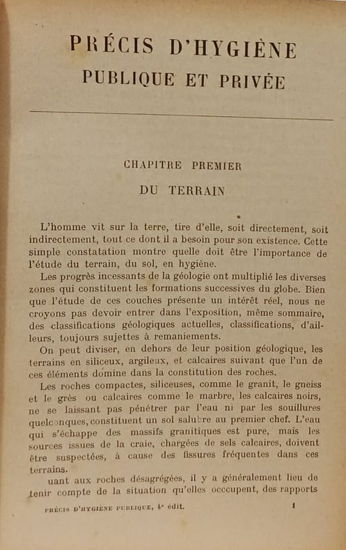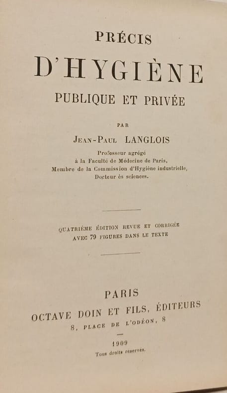 Octave Doin et fils éditeurs 1909 in12. 1909. Cartonné. Ce précis rédigé par Jean-Paul Langlois à la fin du XIXe ou au début du XXe siècle est un ouvrage de référence qui résume les principaux aspects de l'hygiène. Il aborde de manière détaillée des thèmes comme le terrain l'eau l'atmosphère l'alimentation l'habitation l'hygiène industrielle et la lutte contre les maladies contagieuses s'inscrivant dans le courant hygiéniste de l'époque post-pasteurienne