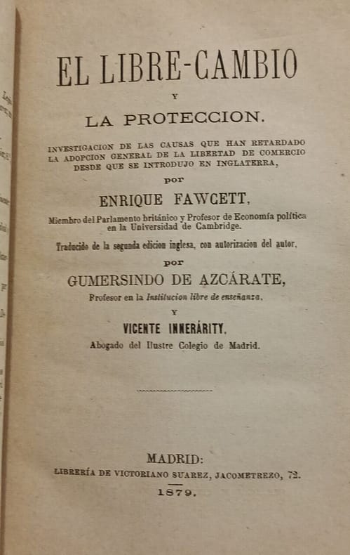 Librería de Victoriano Suárez 1879 in12. 1879. Relié. Cet ouvrage d'Enrique Fawcett professeur d'économie politique à Cambridge et membre du Parlement britannique examine les raisons qui ont retardé l'adoption généralisée du libre-échange depuis son introduction en Angleterre. Il s'agit d'une traduction de la deuxième édition anglaise réalisée par Gumersindo de Azcárate et Vicente Innerauty