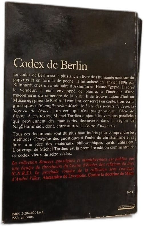 Les Éditions du Cerf 1984 in12. 1984. Broché. Le livre présente une traduction et un commentaire du Codex de Berlin un manuscrit copte qui réunit plusieurs textes apocryphes chrétiens dont "L'évangile selon Marie" "Le livre des secrets de Jean" "La sagesse de Jésus et Eugnoste" et "L'acte de Pierre"