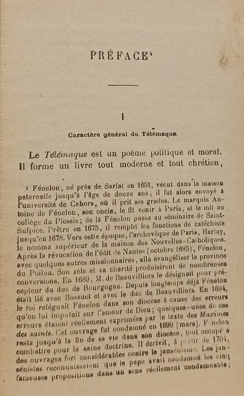 Les Aventures de Télémaque" et "Les Aventures d'Aristonous" sont deux œuvres distinctes écrites par François de Salignac de la Mothe-Fénelon, mieux connu sous le nom de Fénelon. "Les Aventures de Télémaque" (Les aventures de Télémaque, fils d'Ulysse) est un roman éducatif et utopique écrit par Fénelon au début du XVIIIe siècle. L'œuvre a été rédigée pour l'éducation du duc de Bourgogne, petit-fils du roi Louis XIV. Dans ce récit, Télémaque, le fils d'Ulysse, est le protagoniste et est accompagné par son précepteur, Mentor (une figure inspirée de Fénelon lui-même), dans ses voyages à la recherche de la sagesse et de la vertu. L'ouvrage aborde des thèmes politiques, sociaux et moraux et vise à transmettre des leçons éducatives aux jeunes lecteurs. "Les Aventures d'Aristonous" (Les aventures d'Aristonous, fils d'Ulysse) est une suite fictive que Fénelon a ajoutée aux "Aventures de Télémaque". Dans cette suite, Fénelon raconte les aventures du personnage d'Aristonous, le frère de Télémaque. Cette partie de l'histoire suit les aventures d'Aristonous après qu'il se soit séparé de Télémaque et Mentor. Nouvelle édition accompagnées de notes philologiques et littéraires, orné de nombreuses gravures Vol in-8, 180x120, superbe reliure demi cuir, tranche de tête dorée, parfait état intérieur, 520pp Paris Garnier sans date vers 1900 ref/C29