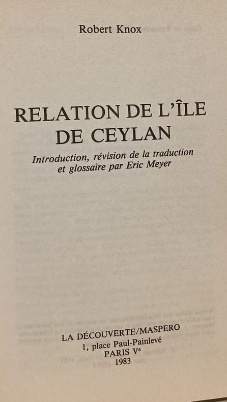 LA DÉCOUVERTE/MASPERO 1983 in12. 1983. Broché. Récit de voyage et de captivité du marin anglais Robert Knox qui passa 19 ans prisonnier du roi de Kandy à Ceylan. Publié en 1681 l'ouvrage offre une description détaillée de la géographie du gouvernement du commerce des moeurs et de la religion des habitants de l'île basée sur son observation minutieuse