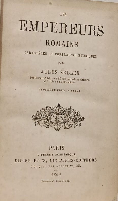 Didier et Cie Libraires-Éditeurs 1869 in12. 1869. Relié. Ouvrage historique de Jules Zeller publié en 1862 analysant les caractères et portraits des empereurs romains. L'auteur cherche à montrer les différences essentielles de nature et d'espèce entre les vertus et les vices des souverains au-delà des simples nuances. Le livre propose une étude psychologique et morale des figures impériales
