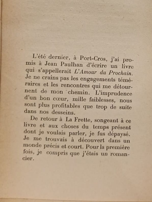 ÉDITION ORIGINALE. 1/300 exemplaires numérotés sur alfa réservés à la presse. Envoi à Raymond Lécuyer. Un essai librement composé autour du thème de l’amour du prochain mais qui déborde souvent sur d’autres sujets.