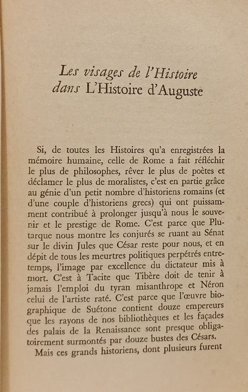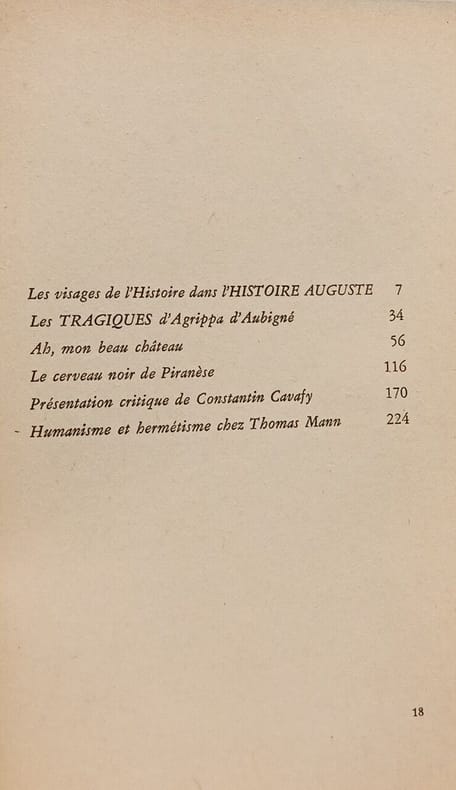 Editions Gallimard, Paris, 1962. In-12, broché sous couverture, 271 pp. Les visages de l'Histoire dans l'Histoire Auguste - Les Tragiques d'Agrippa d'Aubigné - Ah, mon beau château - Le cerveau noir de Piranèse - Selma Lagerlöf, conteuse épique - Présentation critique de Constantin Cavafy - Humanisme et hermétisme chez Thomas ...