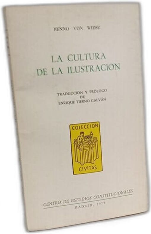 Centro de Estudios Constitucionales 1979 in12. 1979. Broché. Essai de Benno von Wiese sur la culture du siècle des Lumières traduit et préfacé par Enrique Tierno Galván. L'ouvrage analyse l'influence décisive de la pensée des Lumières sur l'éducation la critique sociale et la civilisation du XVIIIe siècle