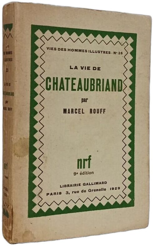 Librairie Gallimard 1929 in12. 1929. Broché. Biographie de l'écrivain français Chateaubriand par Marcel Rouff publiée en 1929 dans la collection "Vies des hommes illustres". L'ouvrage explore sa jeunesse ses combats et ses œuvres en mettant en lumière la complexité de son caractère au-delà de l'image romantique qu'il a cultivée